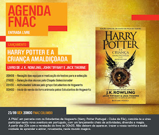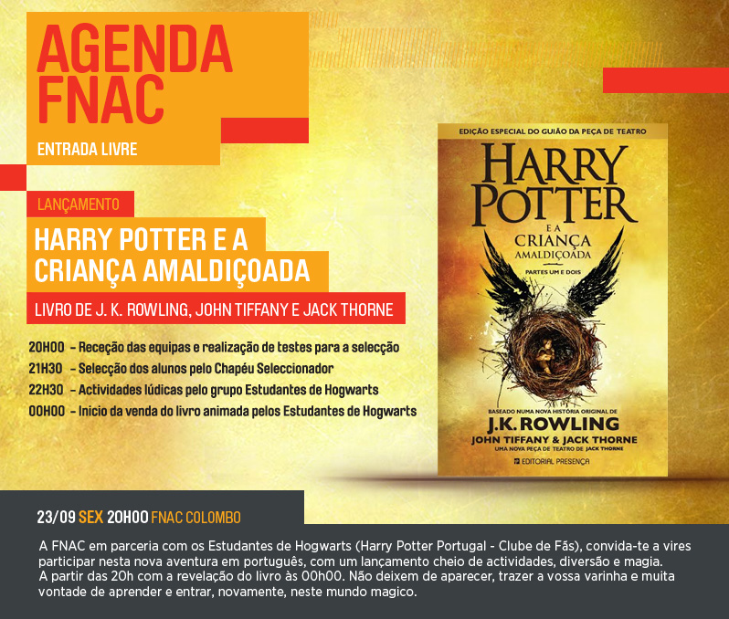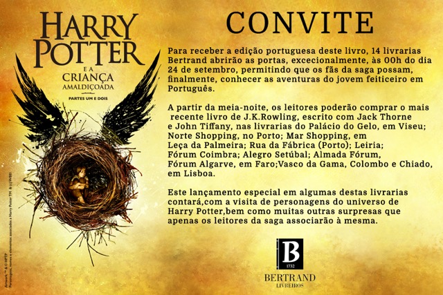 Para receber a edição portuguesa deste livro, 14 livrarias Bertrand abrirão as portas, excecionalmente, às 00.00 h do dia 24 de setembro. Este lançamento especial em algumas destas livrarias contará com a visita de personagens do universo de Harry Potter, bem como muitas outras surpresas que apenas os leitores da saga associarão à mesma.
